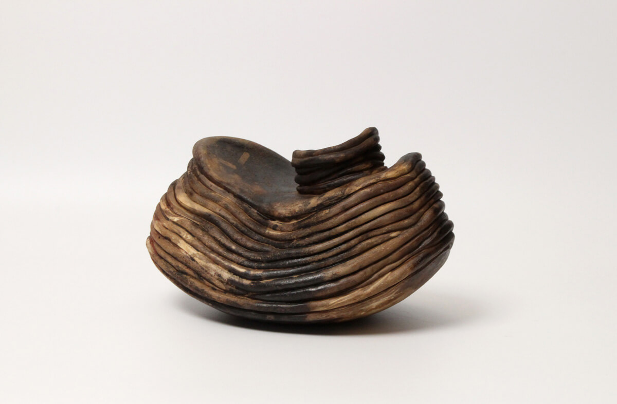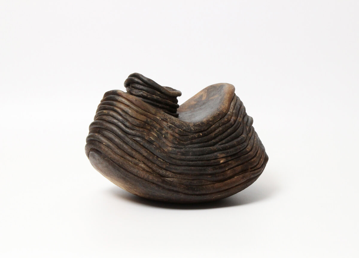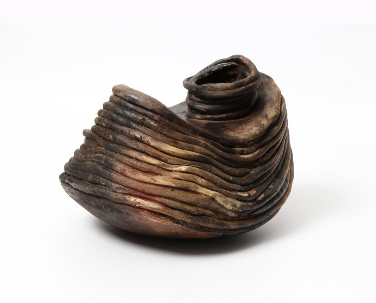 A Small Geographical Sigh is a low-profile sculptural ceramic vessel with a quiet, grounded presence. Its compact form is wrapped in closely layered ridges that move gently around the body—creating rhythm, shadow, and tactile depth from every angle. Rich, earthy tones shift subtly across the surface, highlighting the hand-built process and the natural variation that makes each piece one of a kind.