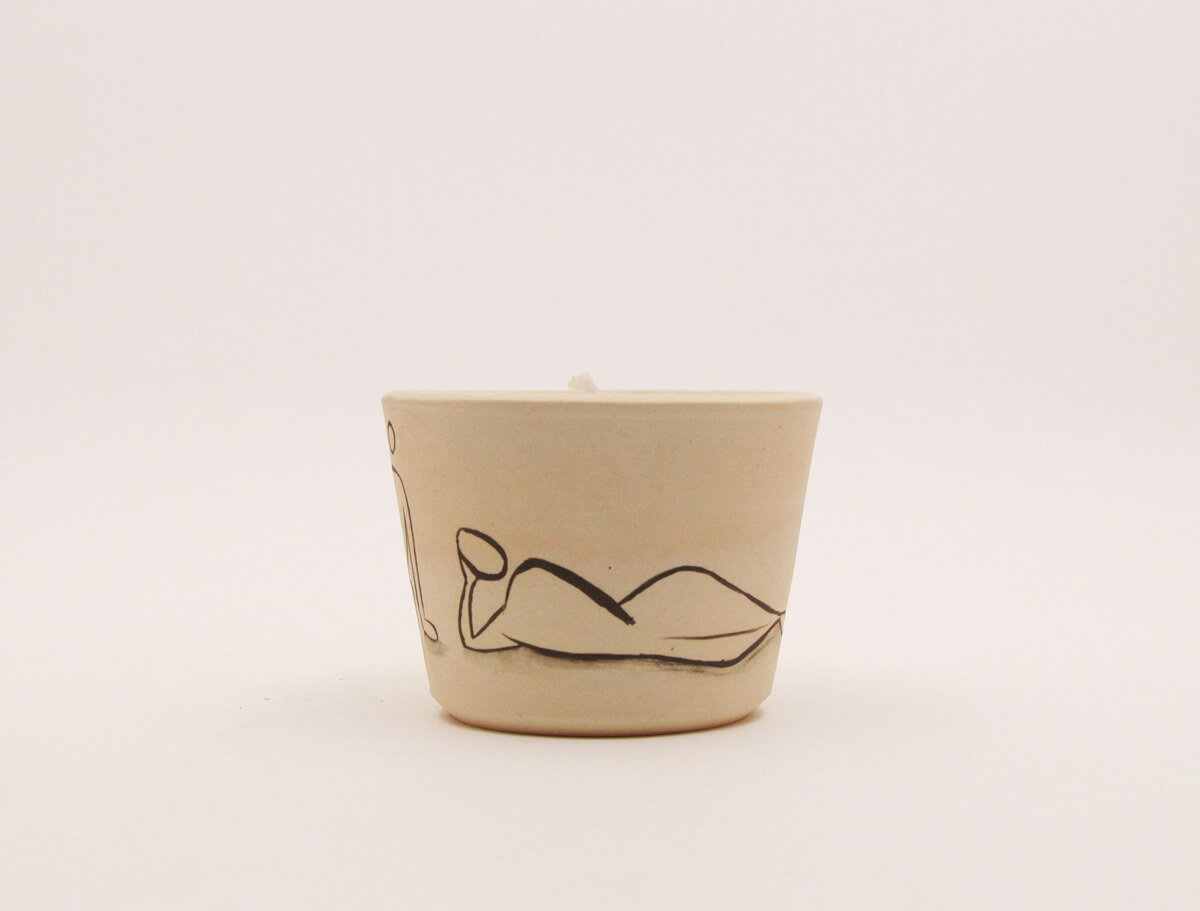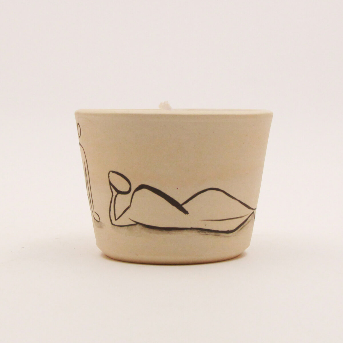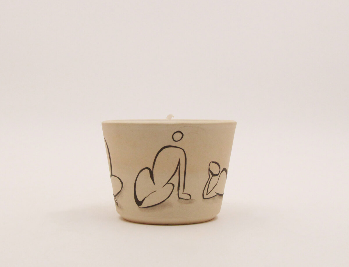 Balance of Being is a handmade ceramic candle holder that blends quiet artistry with everyday ritual. Wrapped in a continuous line drawing of abstract human forms — bent, resting, kneeling — the piece captures stillness in a simple and expressive way. The illustrations are hand-painted in black underglaze over a warm matte clay surface, creating a subtle contrast that feels both modern and timeless.