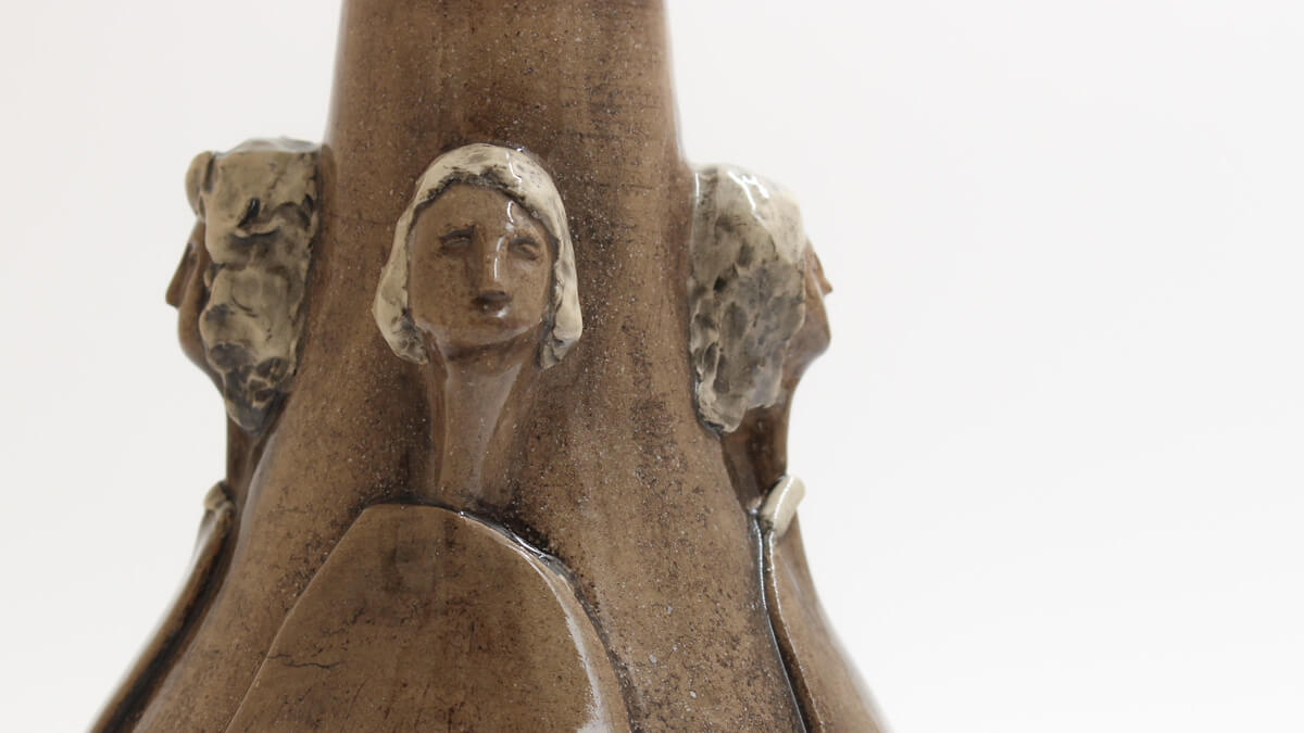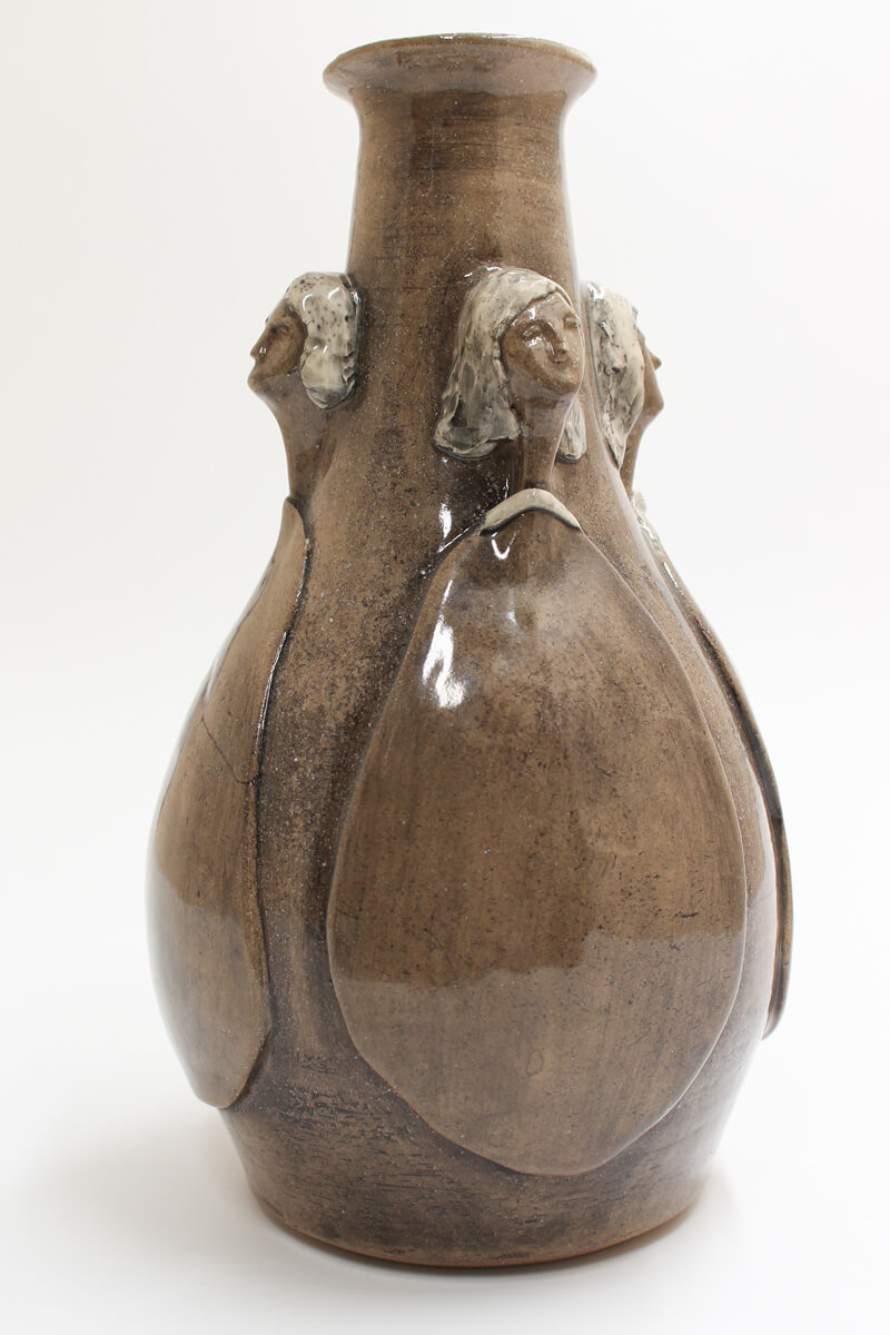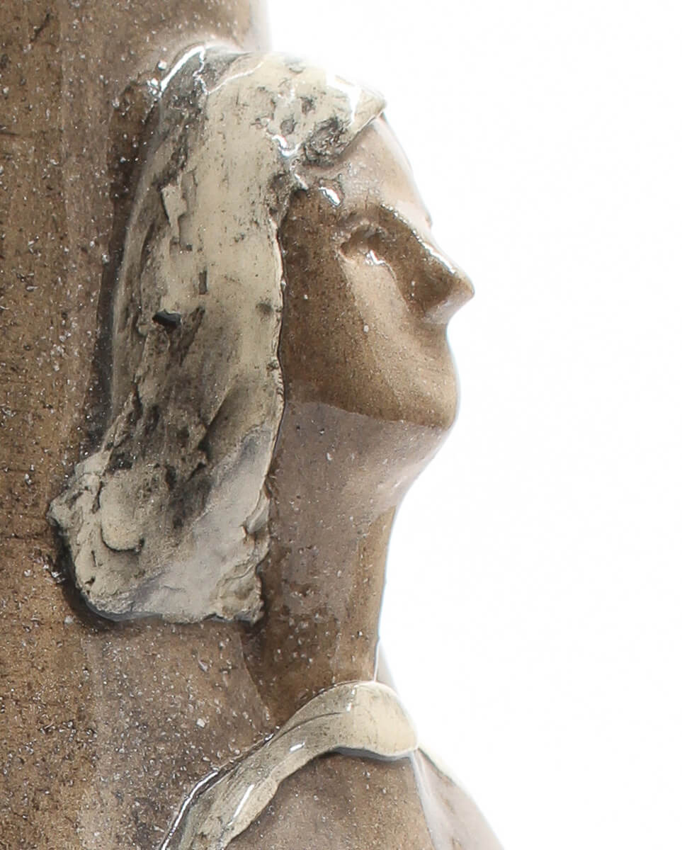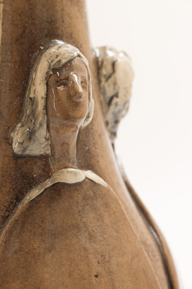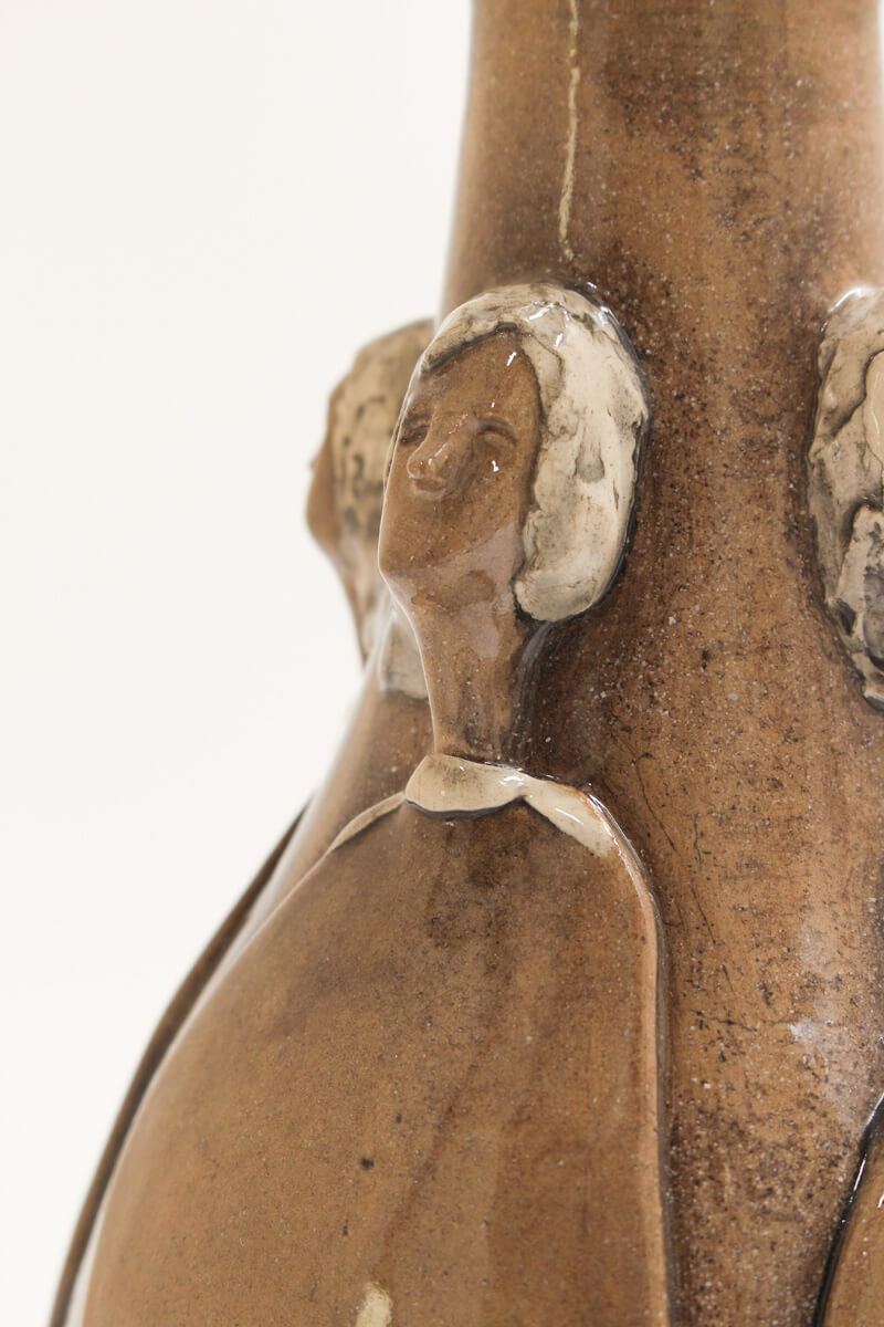 This exquisite handmade ceramic vase blends timeless artistry with contemporary refinement. Its warm, light brown hue is brought to life by a high-gloss finish, enhancing the depth and movement of the sculpted figures that gracefully emerge from its surface. Thoughtfully applied underglaze adds subtle yet expressive touches of colour, accentuating the details and giving the piece a sense of narrative and emotion. Both a functional vessel and a work of art, this vase is perfect for displaying floral arrangements or standing alone as a statement of handcrafted elegance. This vessel serves dual purposes — display it alone as a piece of art, or fill it with blooms for a lively decorative statement. However it is used, it brings beauty to your space.