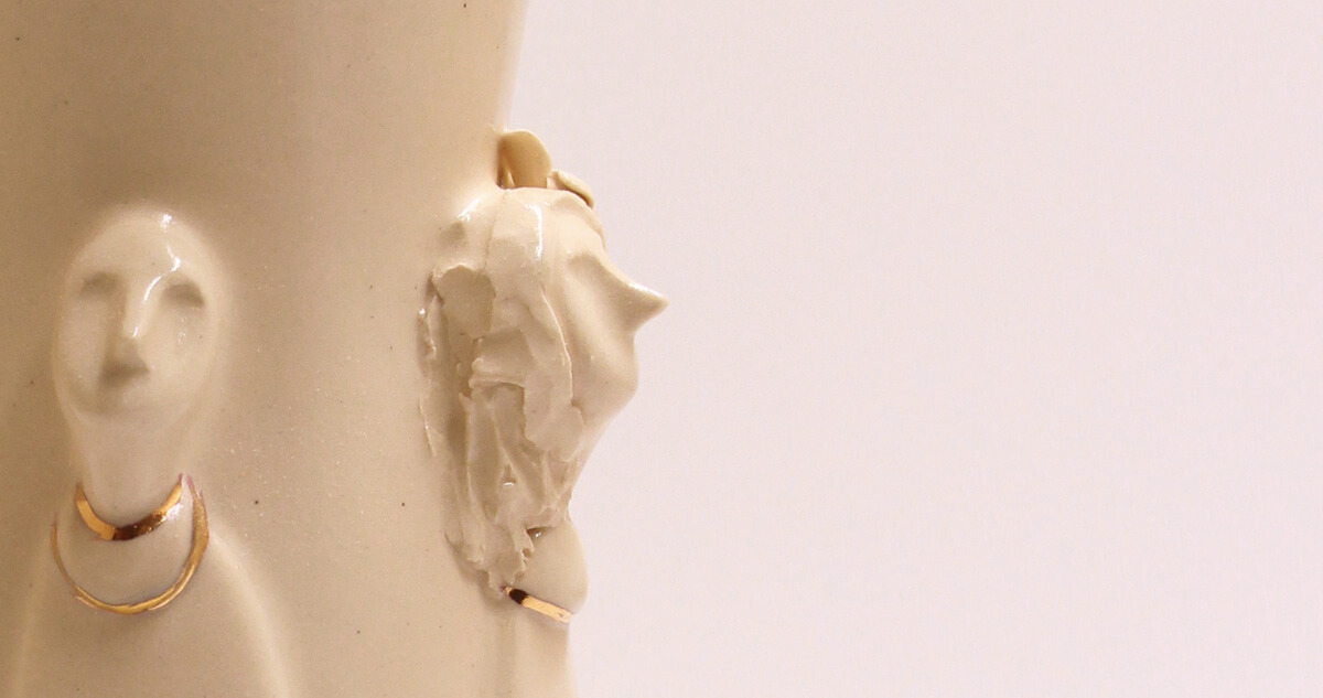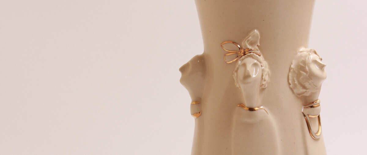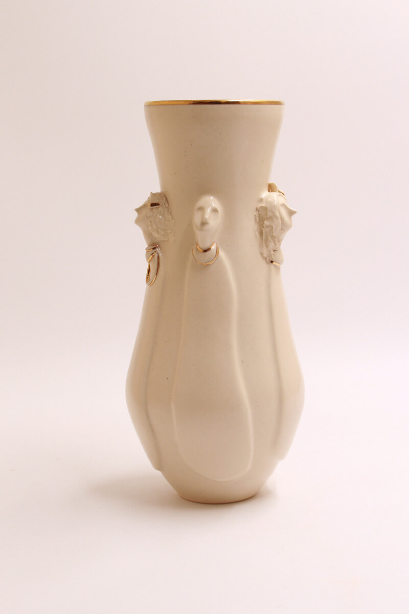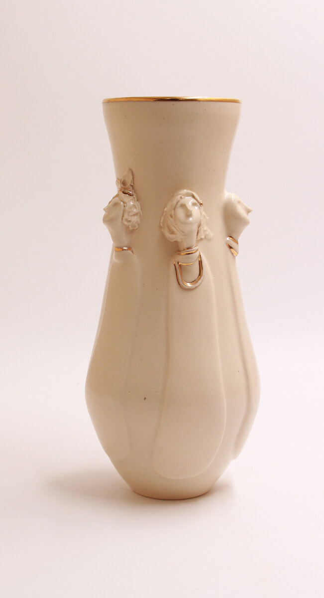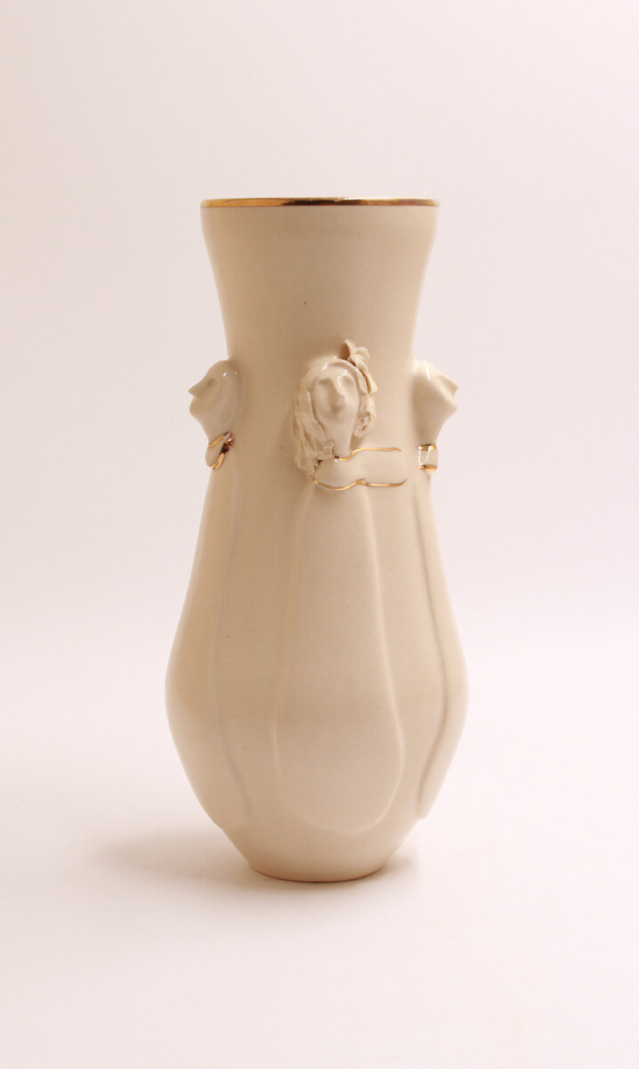 This stunning handmade ceramic vase merges fine craftsmanship with luxurious detail. Sculpted figures emerge seamlessly from its smooth surface, their forms brought to life by a rich, light-toned glaze. A glossy finish enhances the depth and movement of the design, while delicate touches of gold overglaze highlight select details, catching the light and adding an opulent touch. Both a functional vessel and a statement piece, this vase is a testament to artistry and refinement, perfect for any space that appreciates beauty in the details.