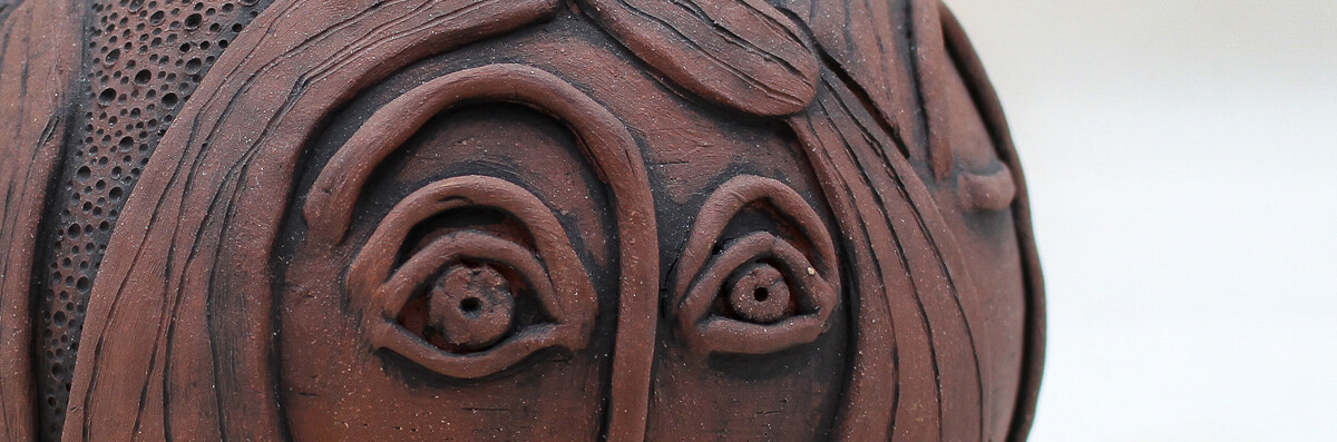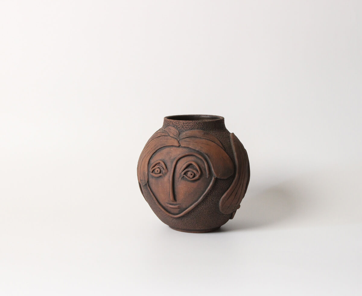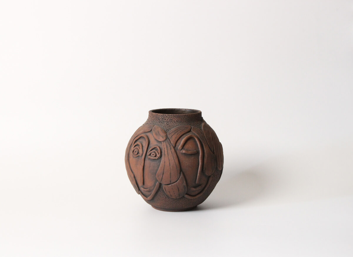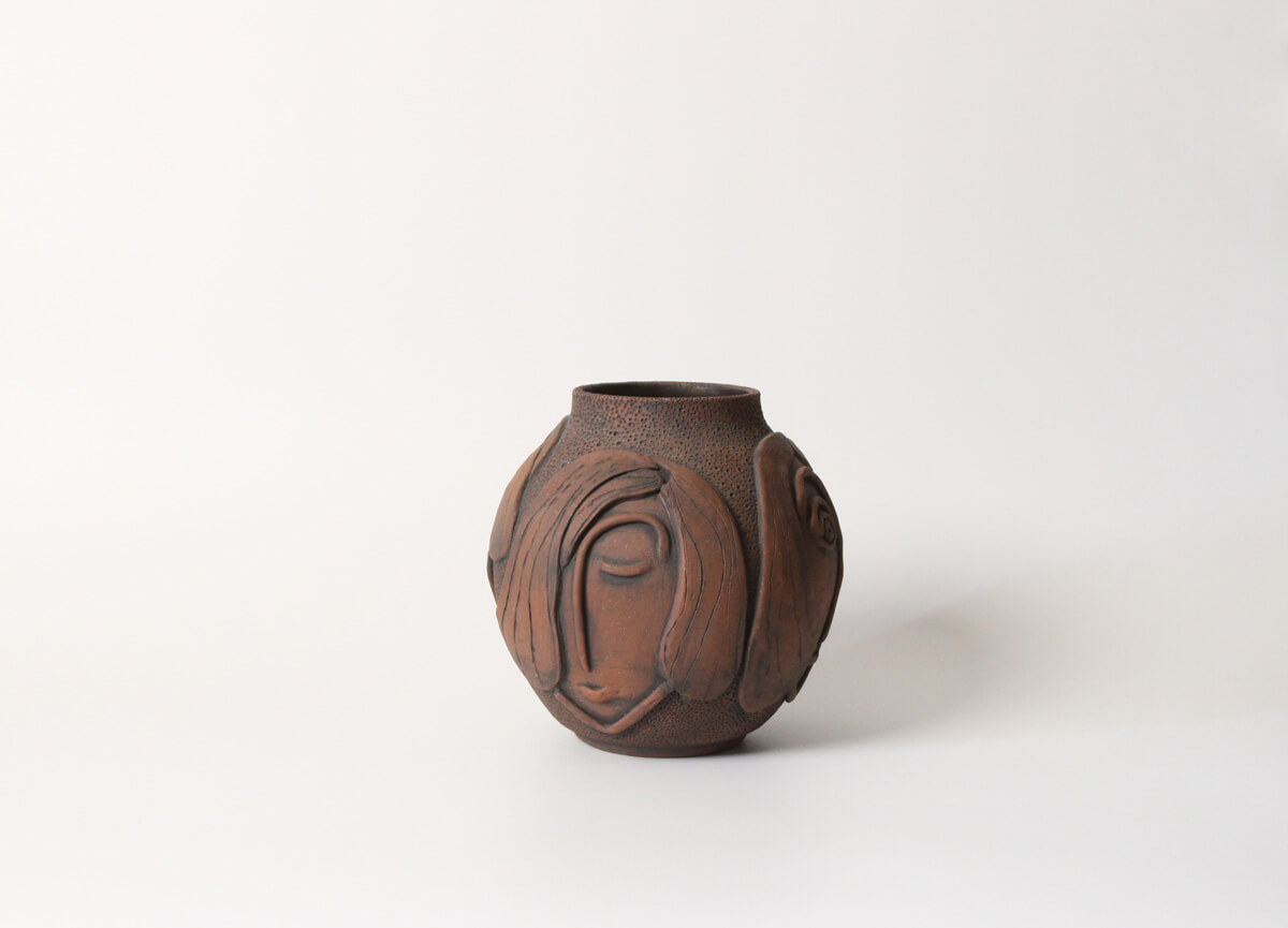 Gulara is a handmade face vase that feels like a quiet conversation captured in clay. Multiple faces emerge around its rounded form—some with eyes closed, others gently open—each holding a different expression, as if shifting between stillness and awareness. Carved hair flows in layered strands, softening the silhouette and contrasting beautifully with the densely textured surface.