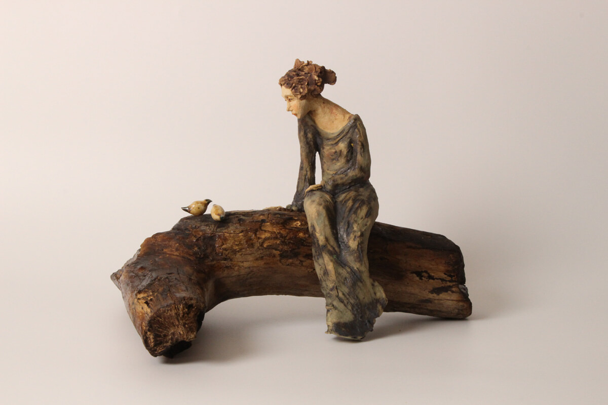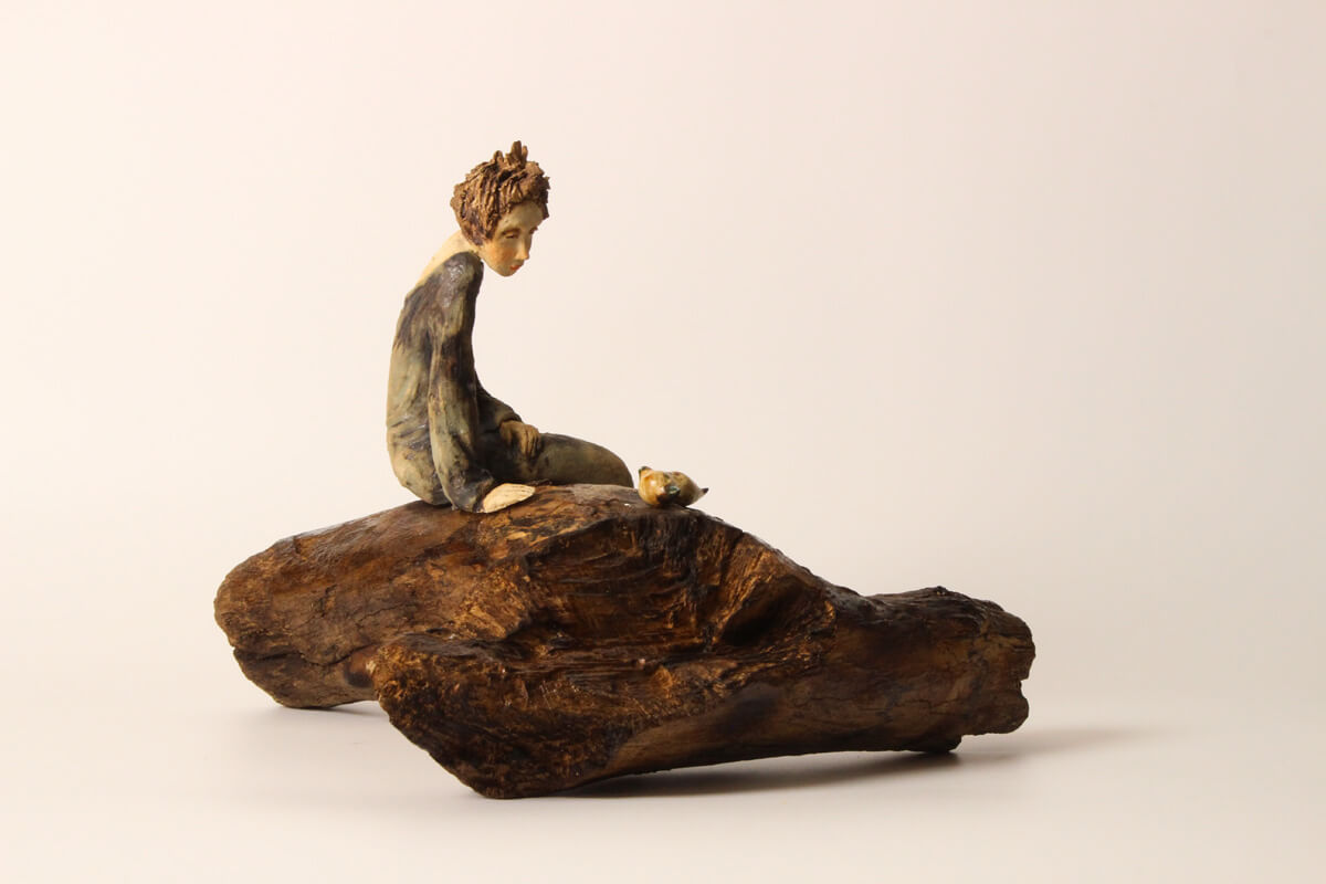 The form of the sculpture is both expressive and grounded. The weathered base evokes natural wood or drifted timber, giving the piece an organic, earth-shaped foundation. Above it, the elongated seated figure introduces softness and humanity, with posture and gesture carrying a sense of restraint, contemplation, and gentle attentiveness. The birds add another layer of meaning, reinforcing themes of stewardship, balance, and the quiet act of letting something grow or take flight on its own.