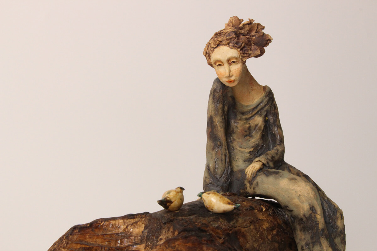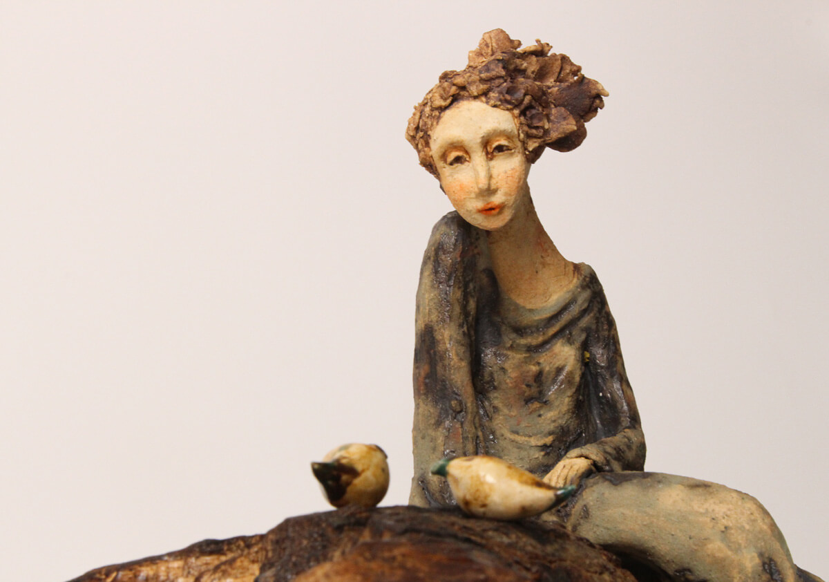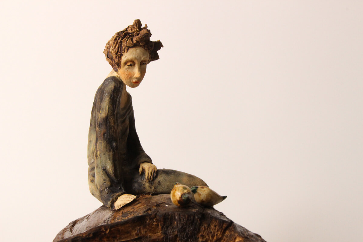 Keeper of Flight is a handmade ceramic sculpture that brings together figure, landscape, and wildlife in a quiet, deeply reflective composition. A seated figure rests atop a branch-like sculptural base while two small birds gather nearby, creating a scene that feels intimate, observant, and full of emotional stillness. The overall composition suggests a moment of trust and connection—one shaped not by force, but by patience, presence, and care.