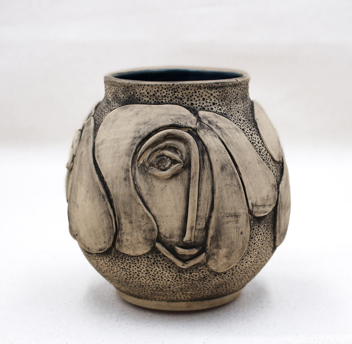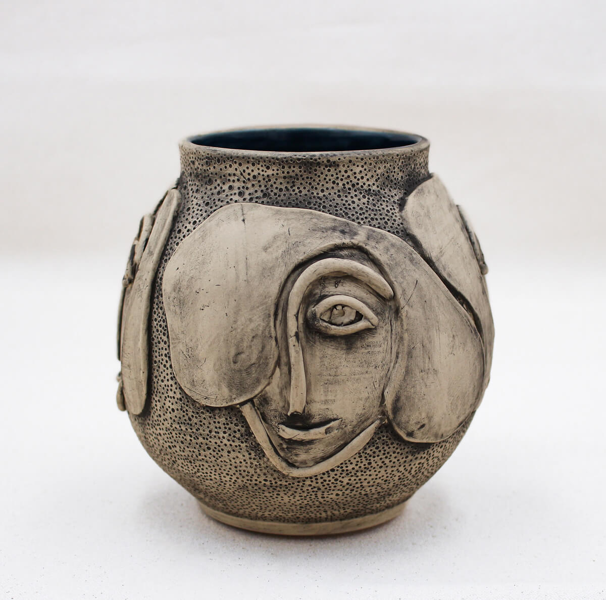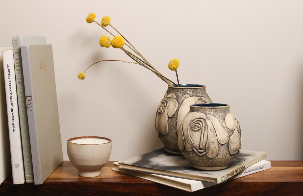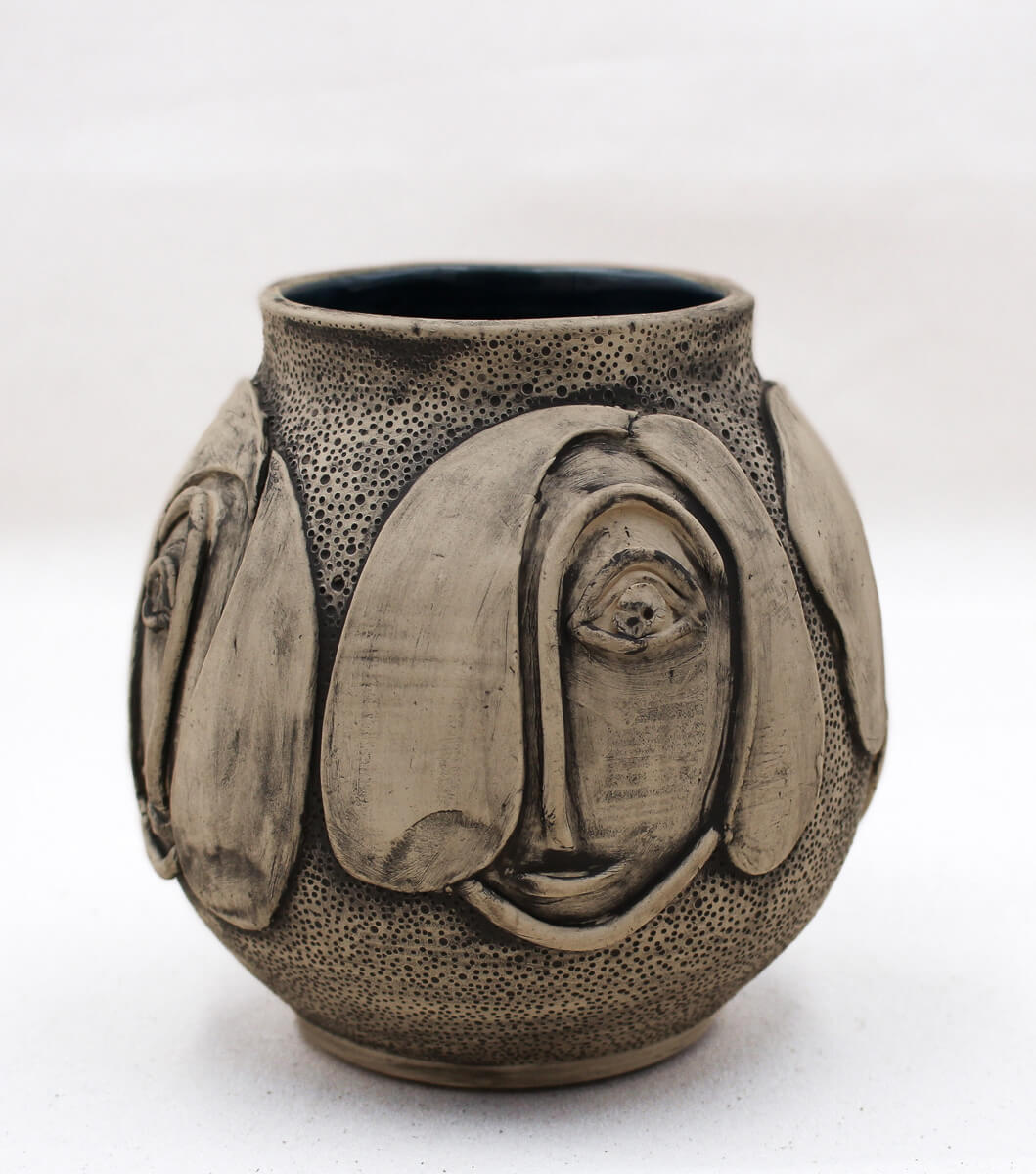 Lunette is a sculptural face vase that feels like a quiet gathering—multiple faces appear across the surface, some nearly merging, others more defined. Each expression reads differently as you move around the form: curious, gentle, contemplative. Crafted from a lighter clay body, the faces catch subtle shifts of shadow and texture, giving the vessel a calm sense of depth and presence.