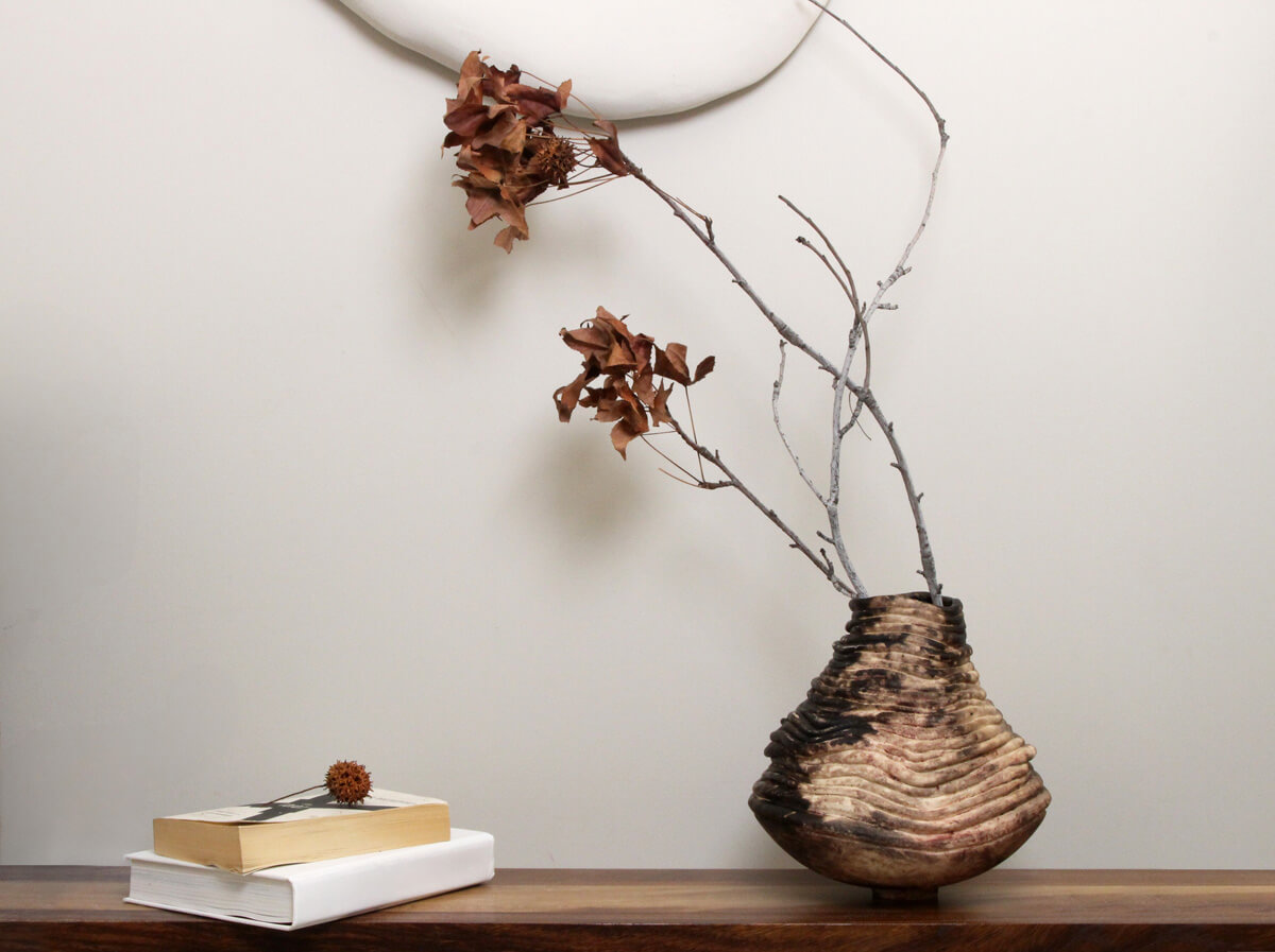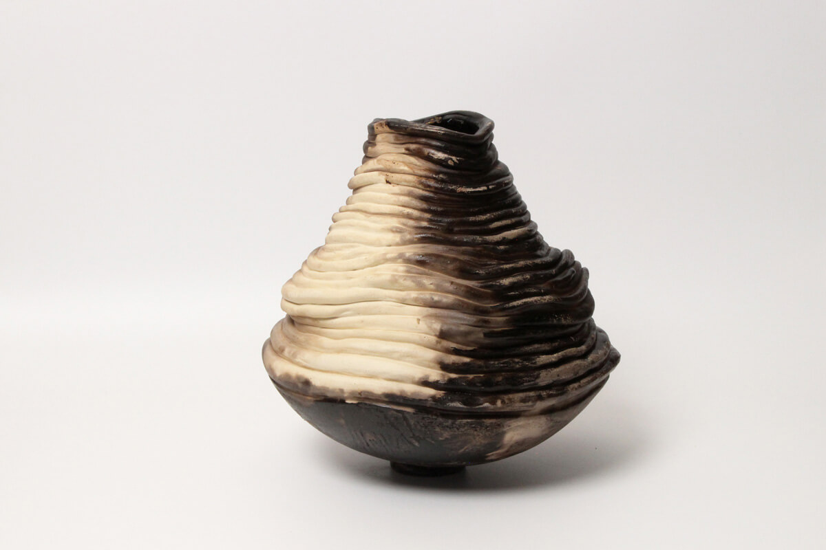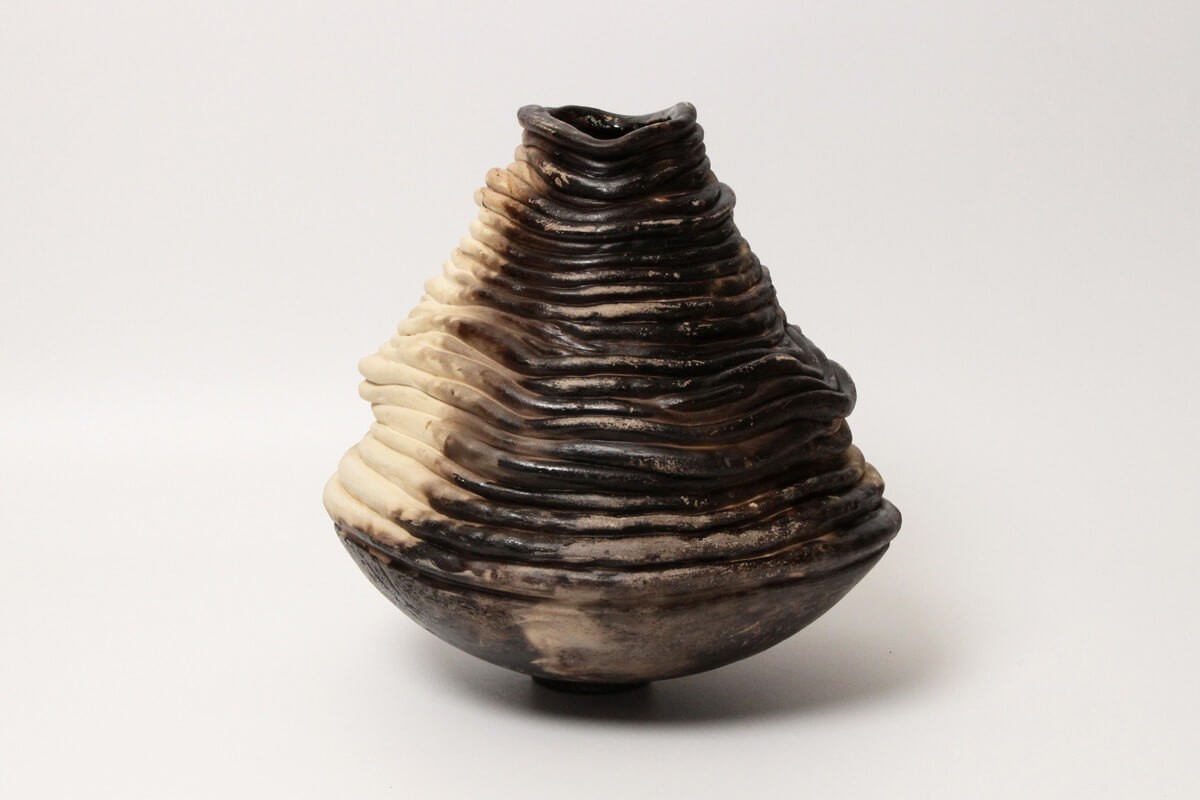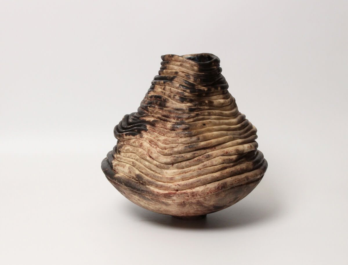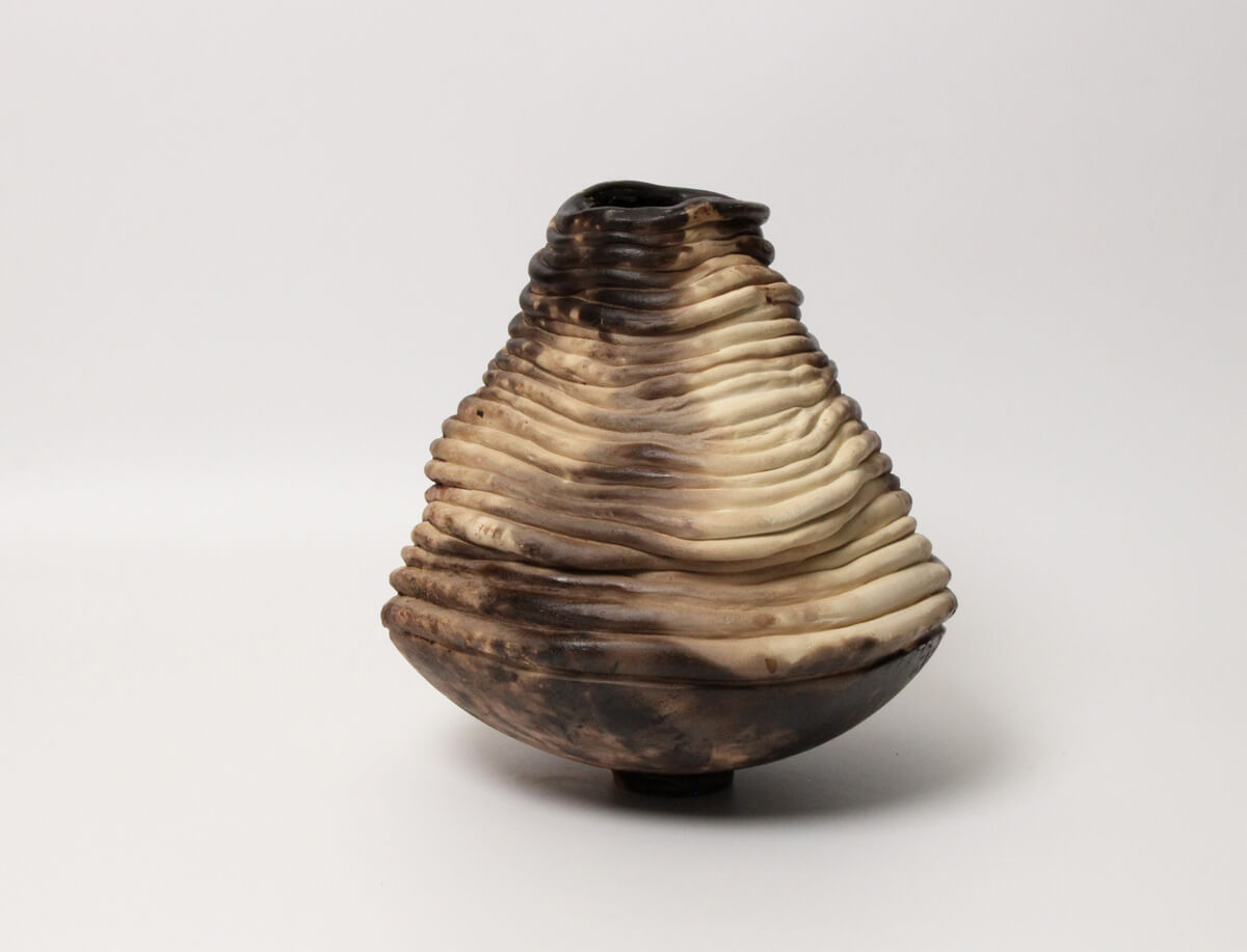 “Murmur from the Earth” is a statement ceramic vessel with a softly tapered silhouette built from layered, flowing ridges—creating a calm sense of movement as light travels across the surface. Warm, natural tones drift through the contours, highlighting the hand-built process and giving the piece depth from every angle.