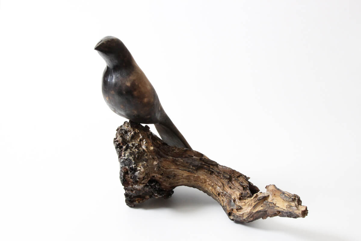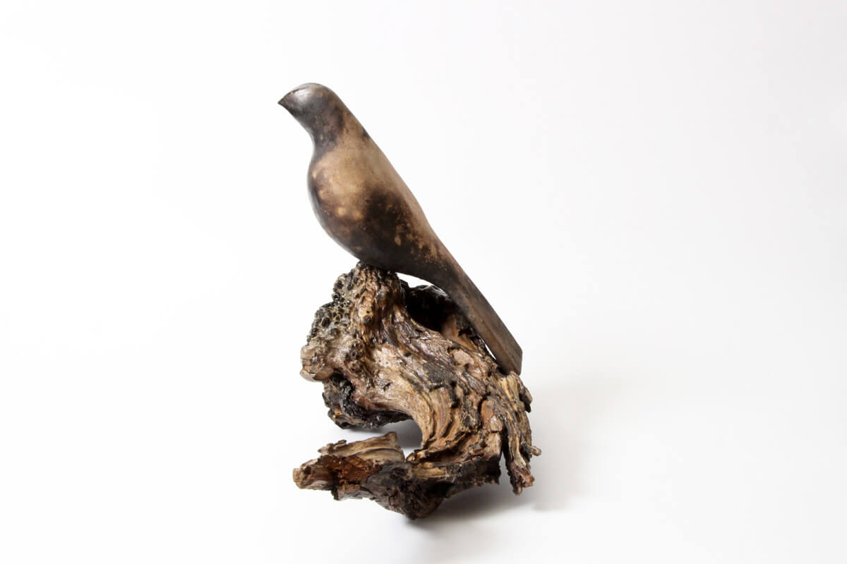 The branch carries a sense of time and exposure, with its worn, organic form grounding the piece in the language of landscape and passage. Above it, the bird holds an alert yet calm posture, bringing balance to the composition through restraint rather than action. The sculpture does not dramatise movement; instead, it honours the quiet tension of in-between moments.