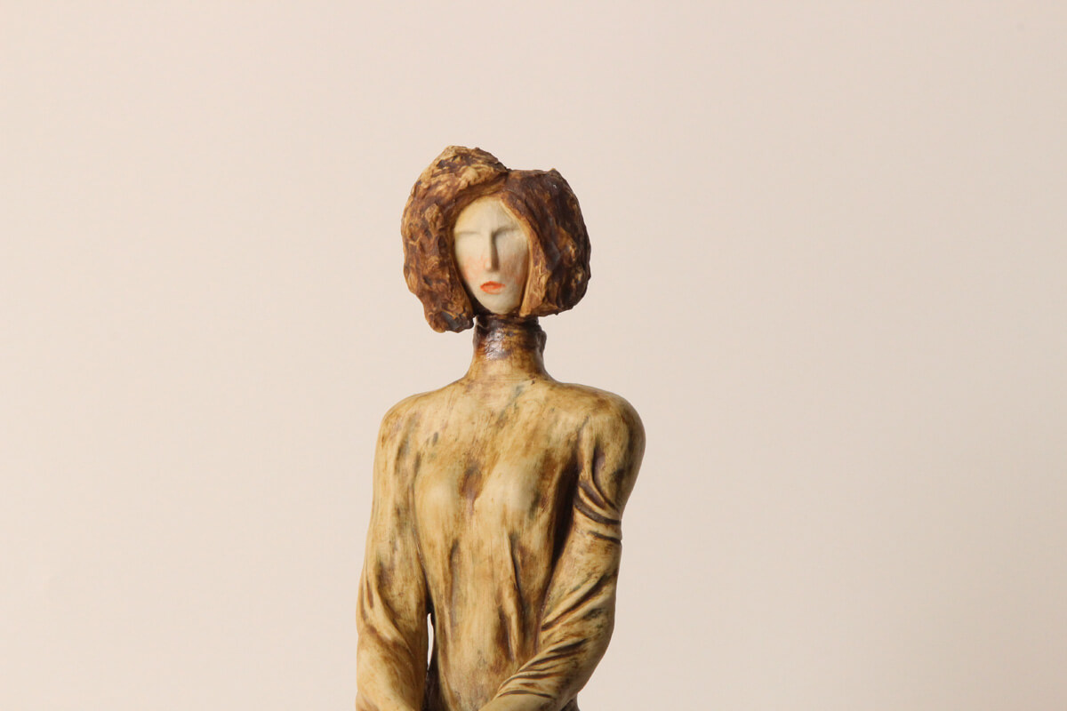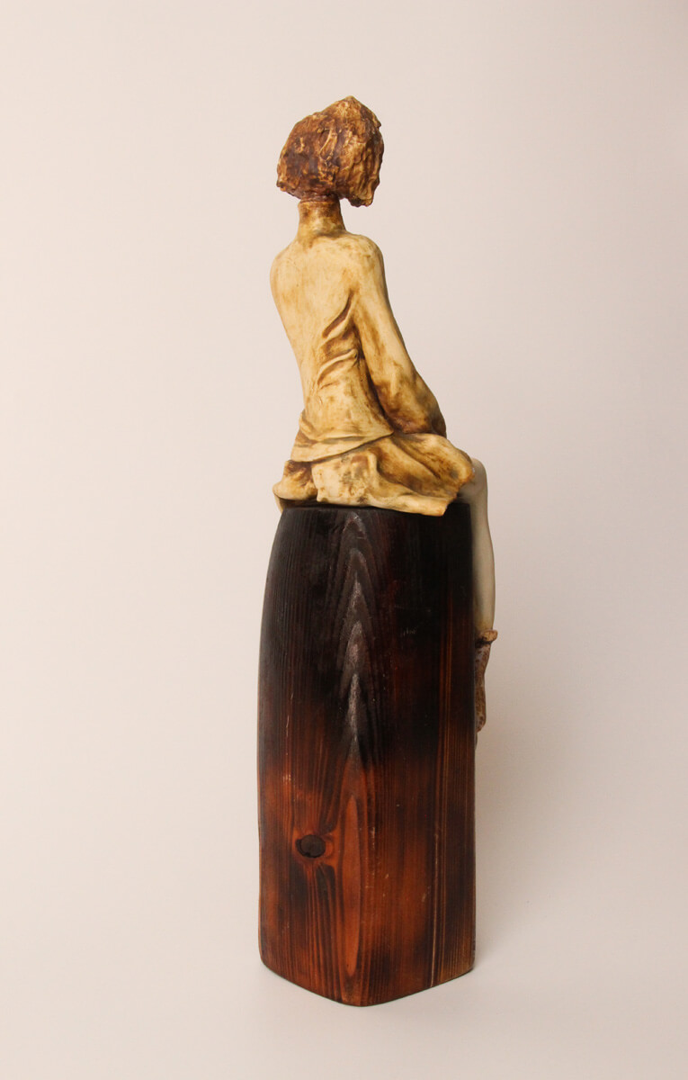 The tilt of the head, placement of the hands, and long vertical lines of the body all suggest awareness without tension. This is a piece that feels intentional and grounded, carrying emotional weight through posture rather than movement. The sculptural pedestal beneath the figure adds height and presence, creating a striking silhouette that draws the eye upward.