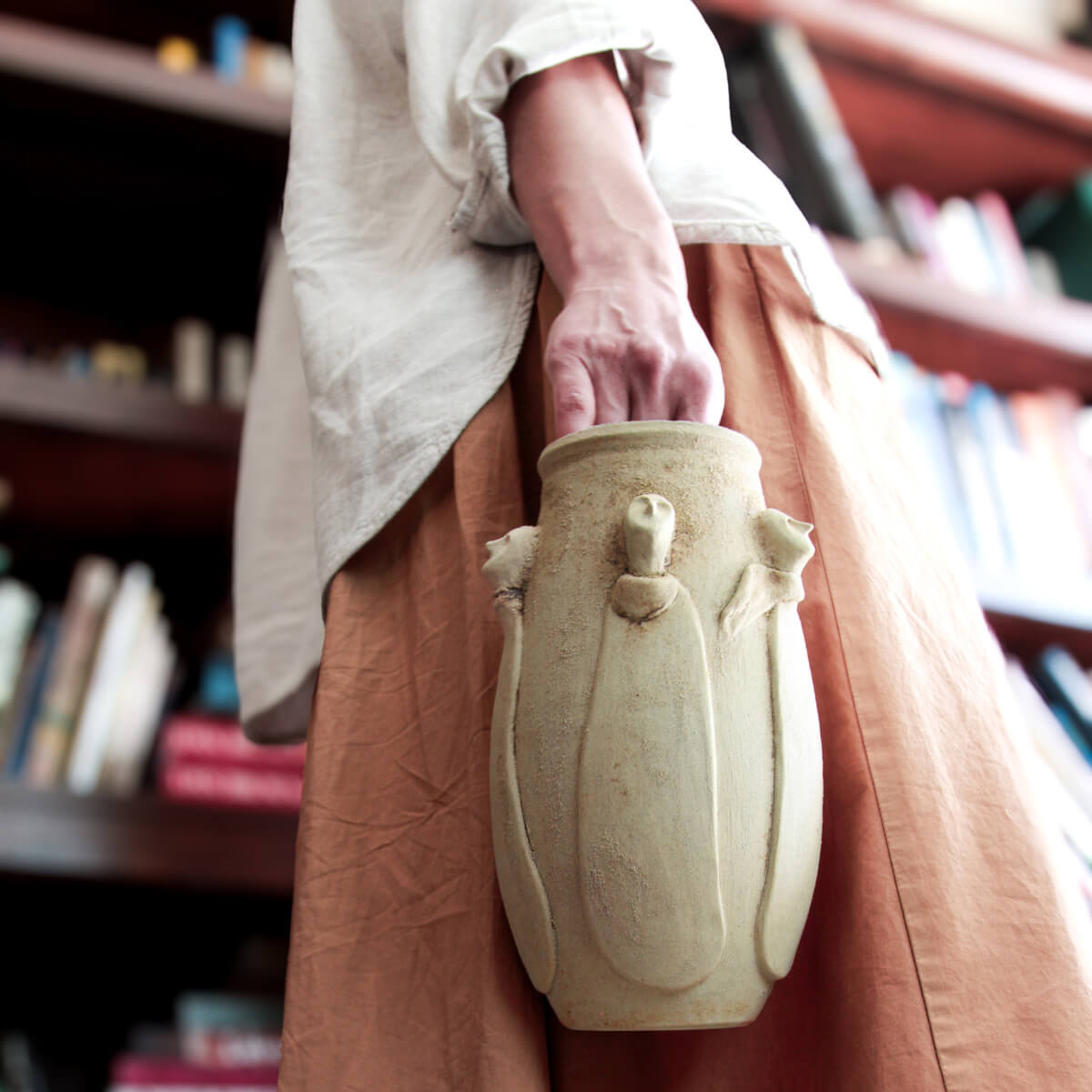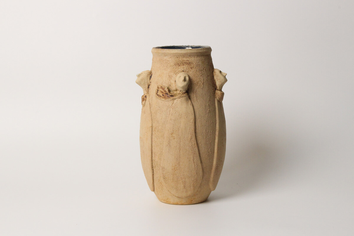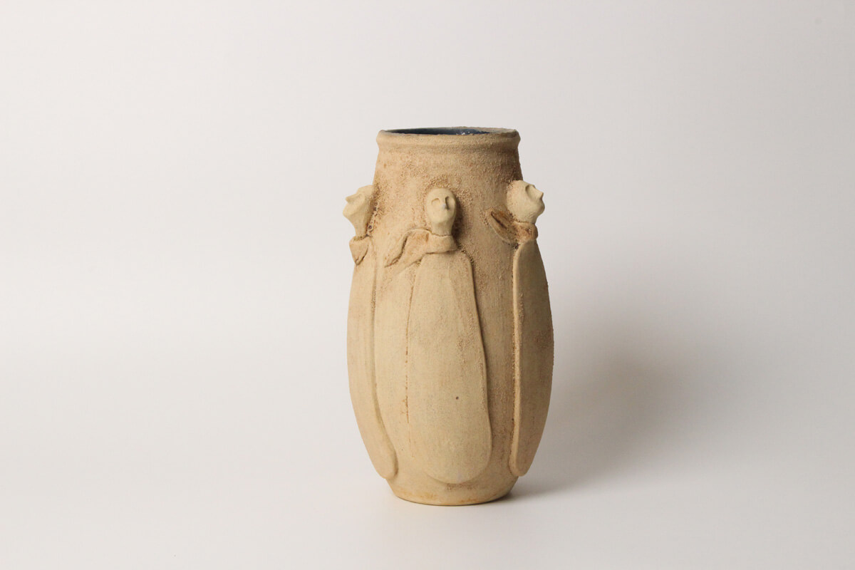 This ceramic vase features simplified figures, each softly sculpted and wrapped in long, flowing scarves. The forms are minimal yet expressive, with rounded heads and elongated shapes that suggest closeness and quiet presence. The glaze adds warmth and texture, gently catching light across the surface. There’s a sense of togetherness here—of people standing side by side, quietly held in place. This piece brings warmth and charm to any space. On its own, this vessel is a striking art object. Add flowers, and it becomes a lively accent—either way, it enhances its surroundings.