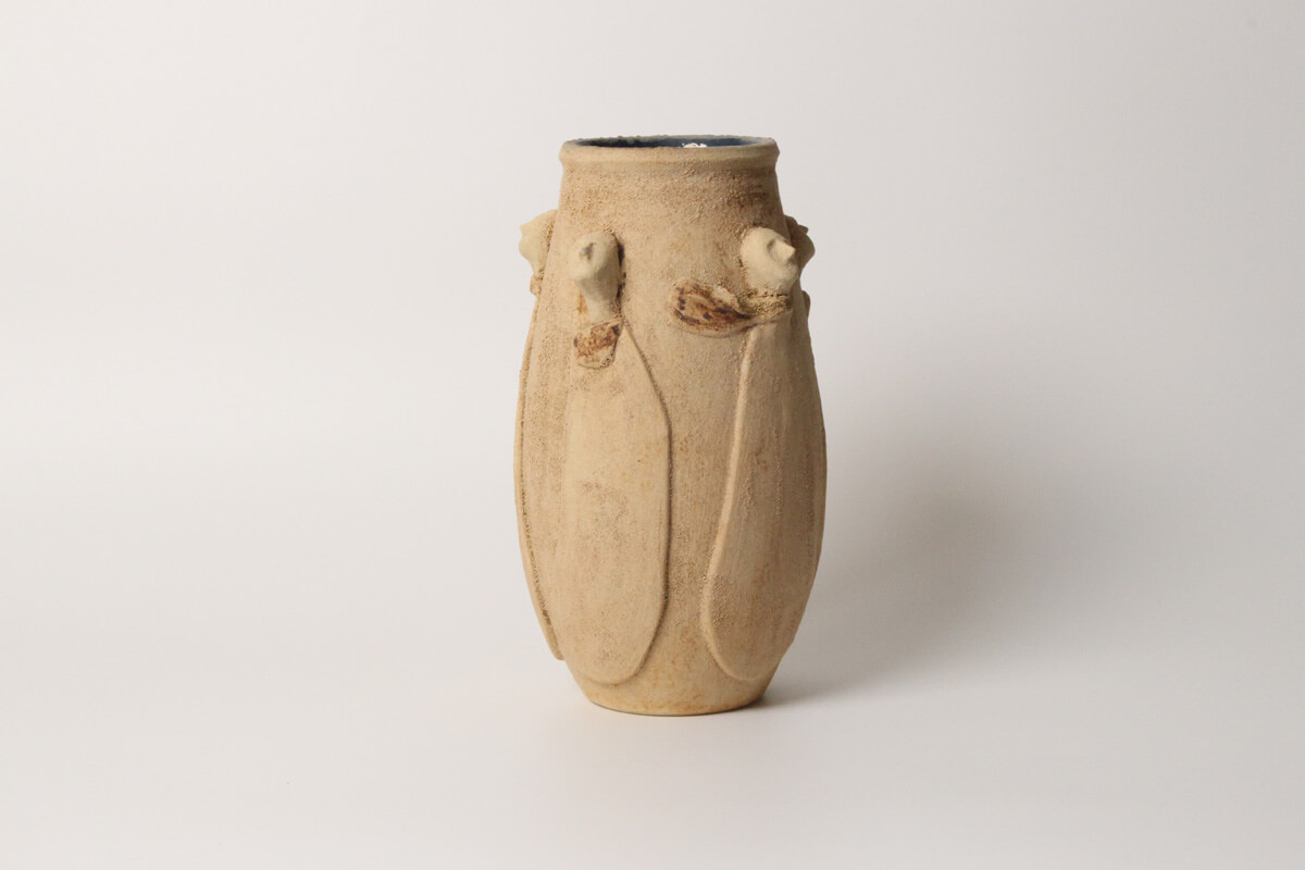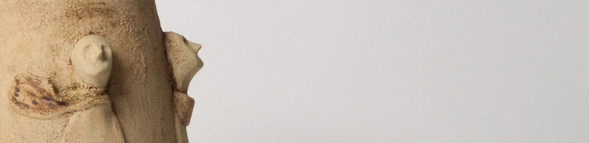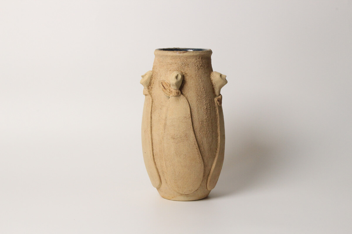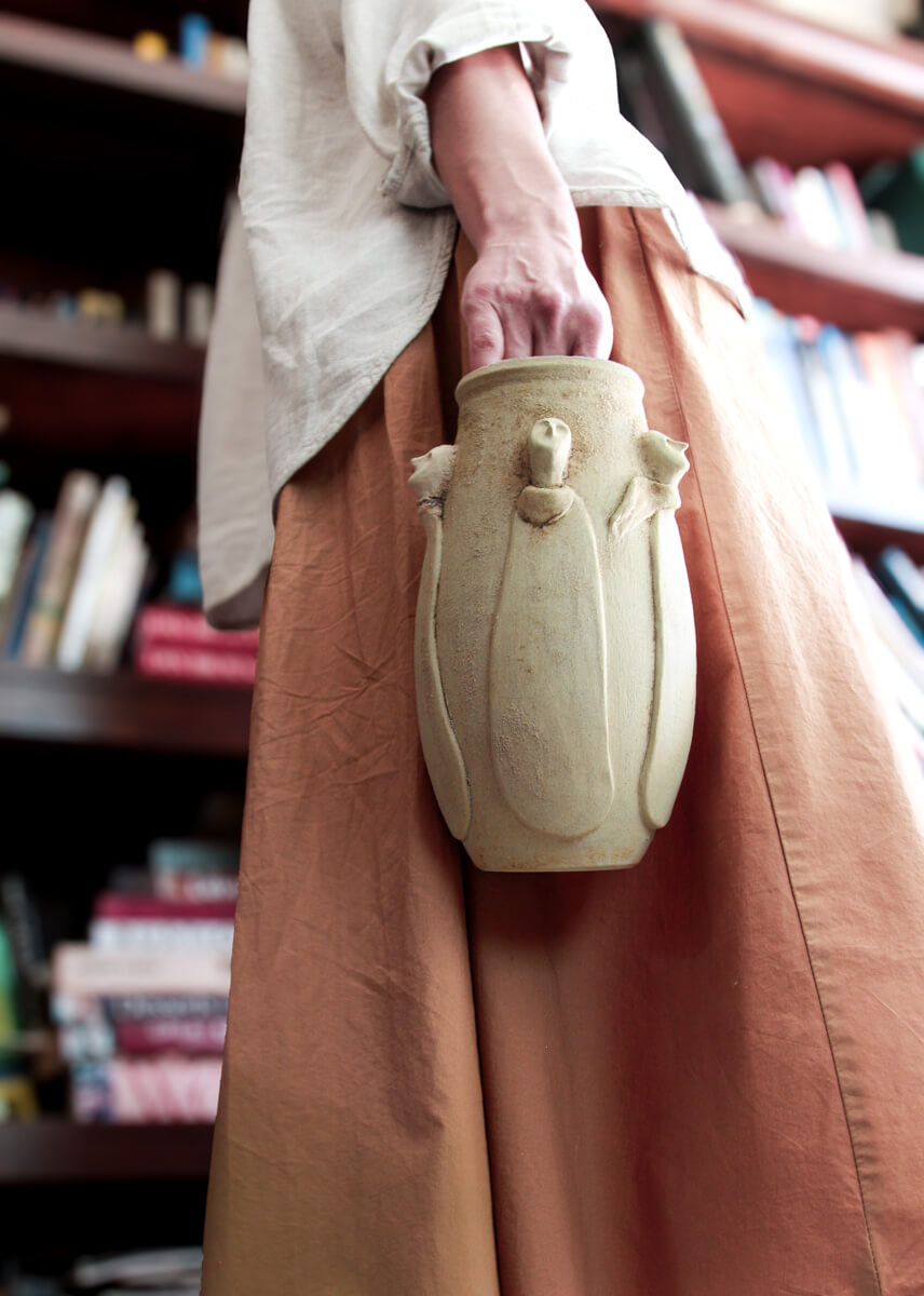 This ceramic vase features simplified figures, each softly sculpted and wrapped in long, flowing scarves. The forms are minimal yet expressive, with rounded heads and elongated shapes that suggest closeness and quiet presence. The glaze adds warmth and texture, gently catching light across the surface. There’s a sense of togetherness here—of people standing side by side, quietly held in place. This piece brings warmth and charm to any space. On its own, this vessel is a striking art object. Add flowers, and it becomes a lively accent—either way, it enhances its surroundings.