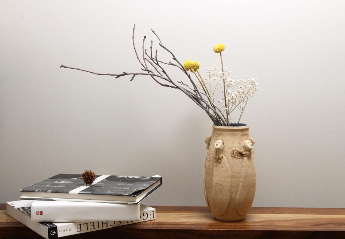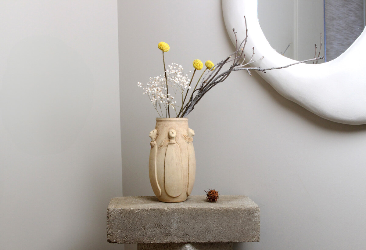 Side by Side is a sculptural handmade ceramic vase that captures quiet connection through minimal figurative forms. Its warm textured surface and balanced shape make it an elegant decorative object for modern interiors.