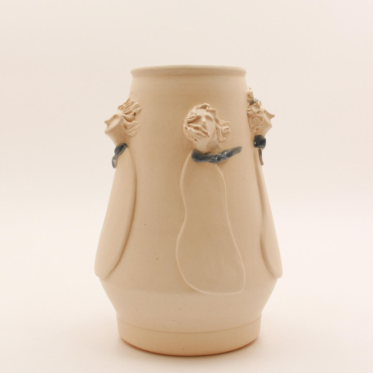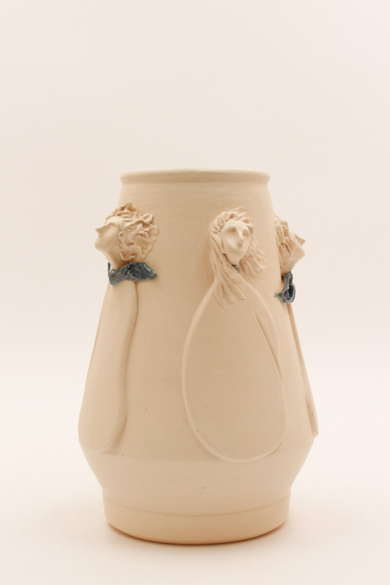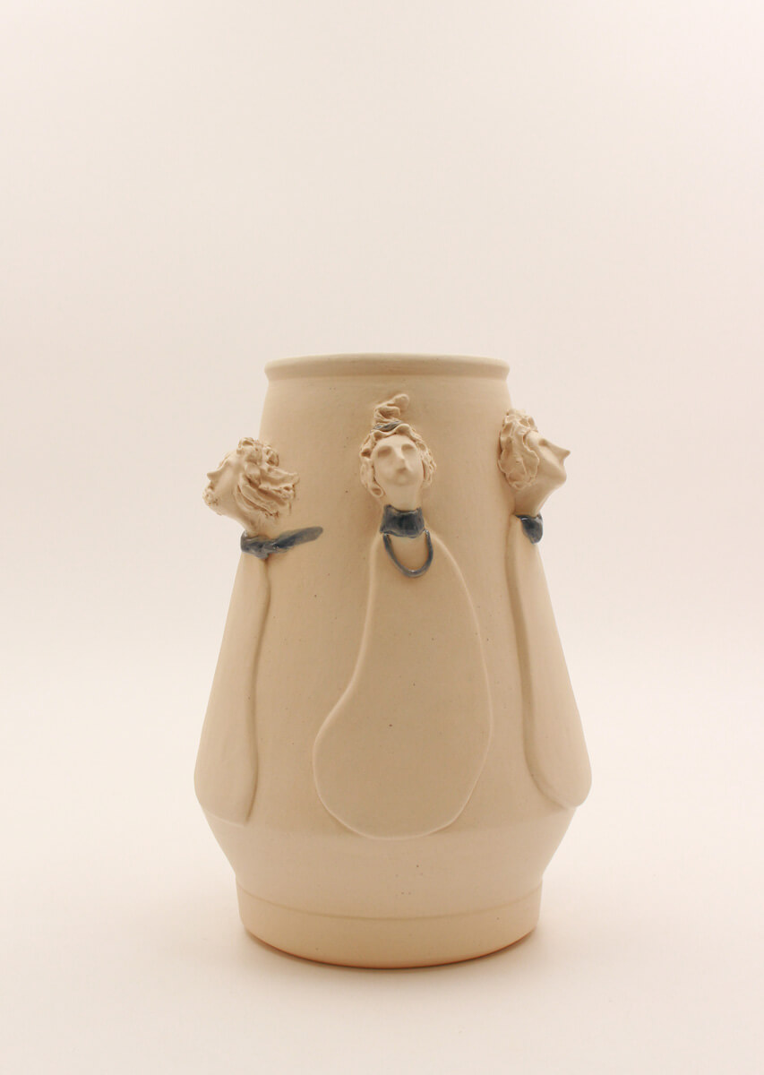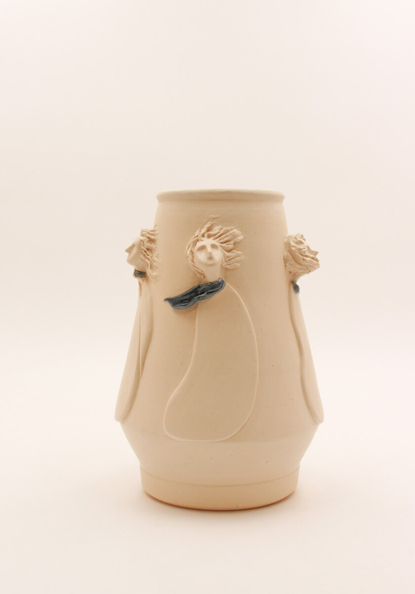 This sculptural vase features hand formed figures emerging from the surface, each with distinct hairstyles and expressions. Minimal yet expressive, their presence evokes quiet strength and individuality. Accents of deep blue glaze add contrast to the soft, raw clay body, enhancing the subtle elegance of the piece. Both decorative and symbolic, it stands as a tribute to feminine connection and identity. This vessel functions as both sculpture and décor, elegant on its own or inviting when filled with blooms, making it a refined addition to any setting.