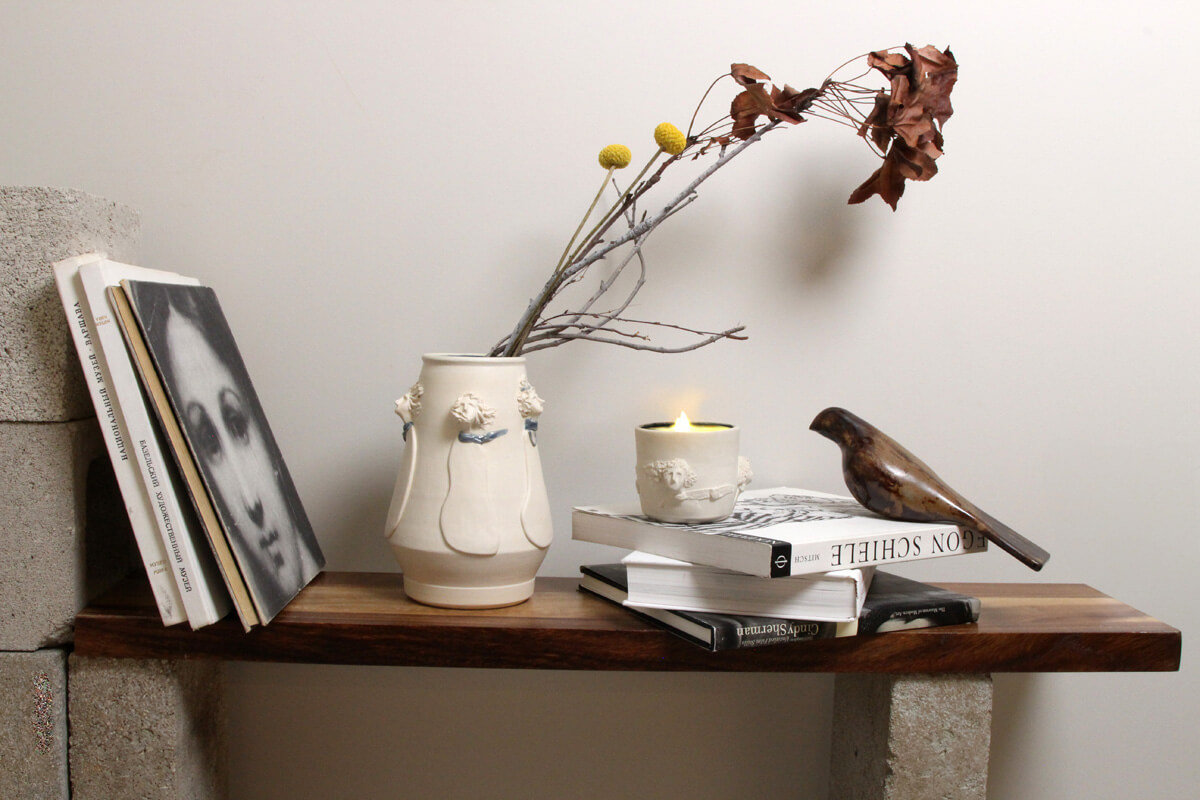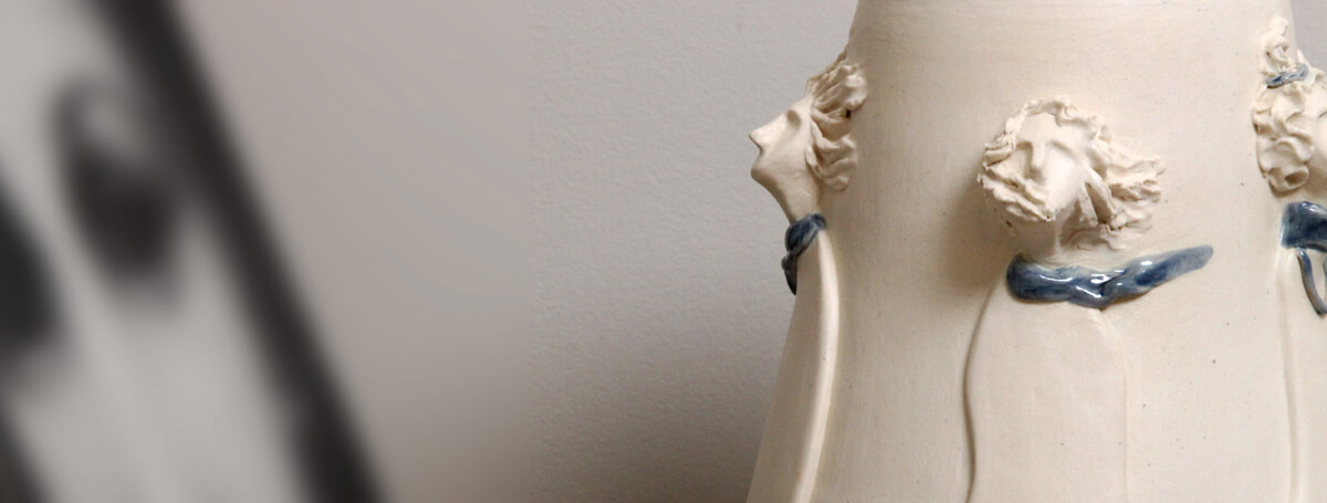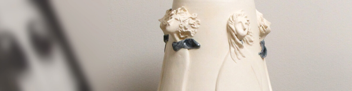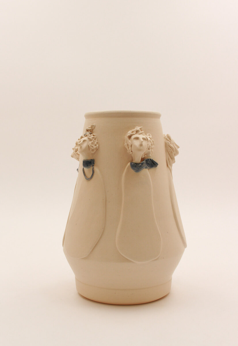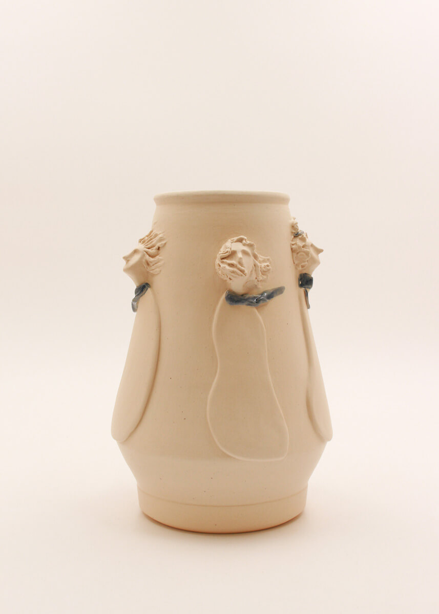 This sculptural vase features hand formed figures emerging from the surface, each with distinct hairstyles and expressions. Minimal yet expressive, their presence evokes quiet strength and individuality. Accents of deep blue glaze add contrast to the soft, raw clay body, enhancing the subtle elegance of the piece. Both decorative and symbolic, it stands as a tribute to feminine connection and identity. This vessel functions as both sculpture and décor, elegant on its own or inviting when filled with blooms, making it a refined addition to any setting.