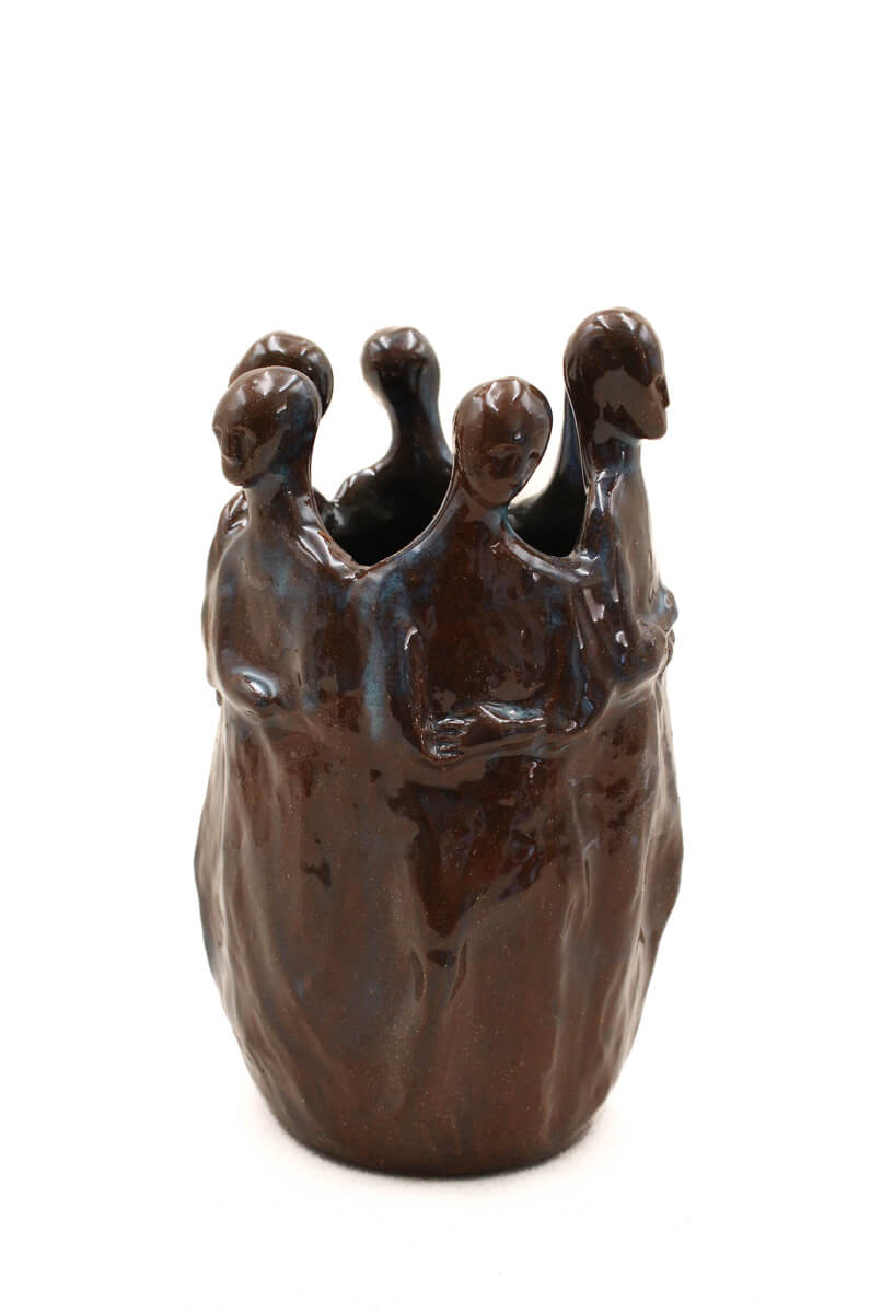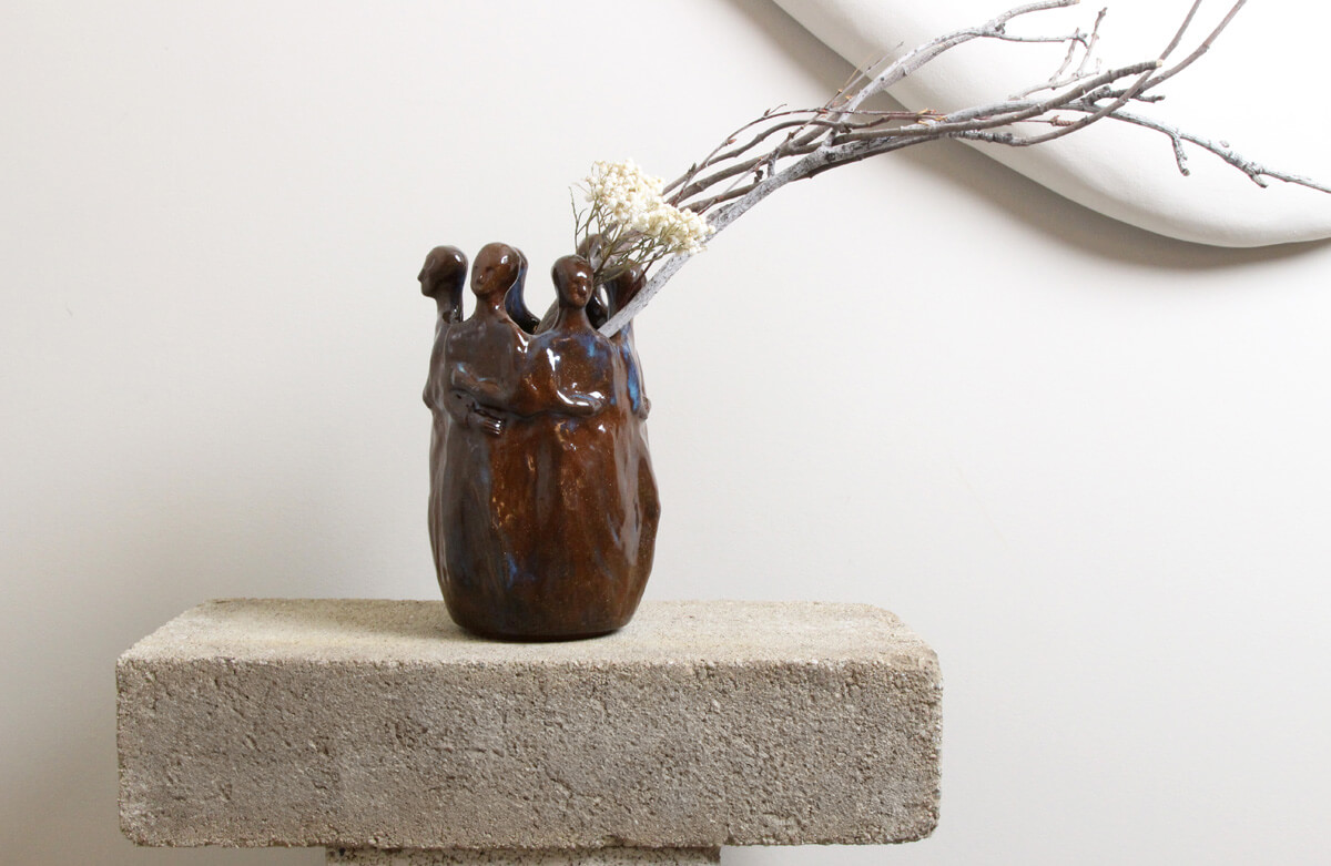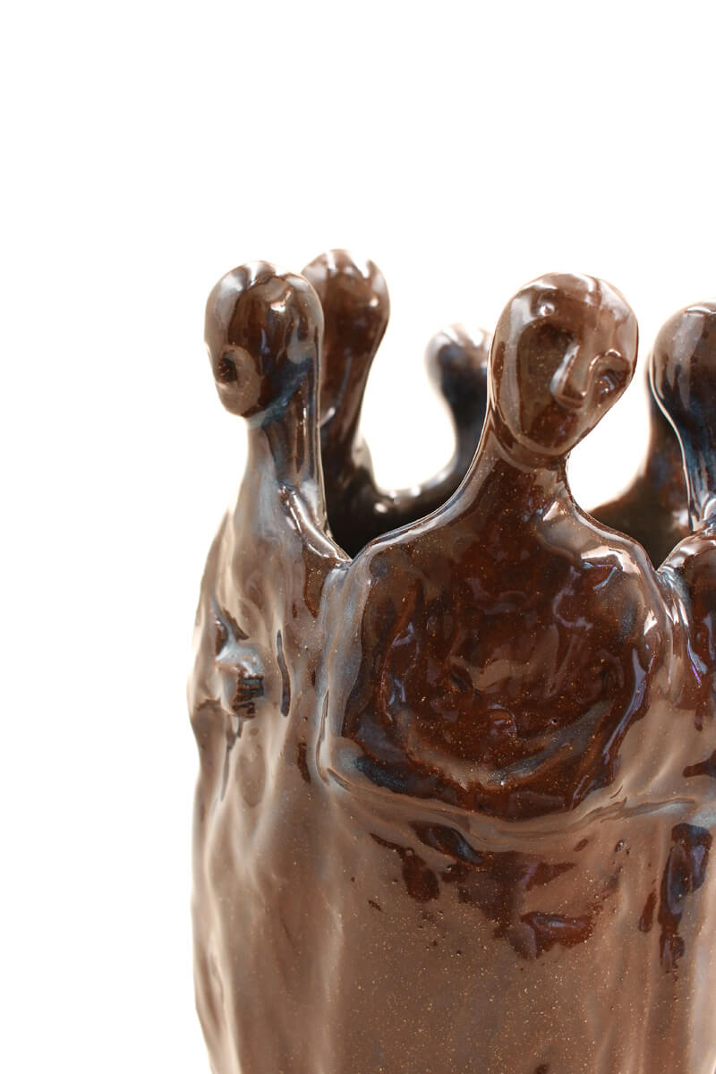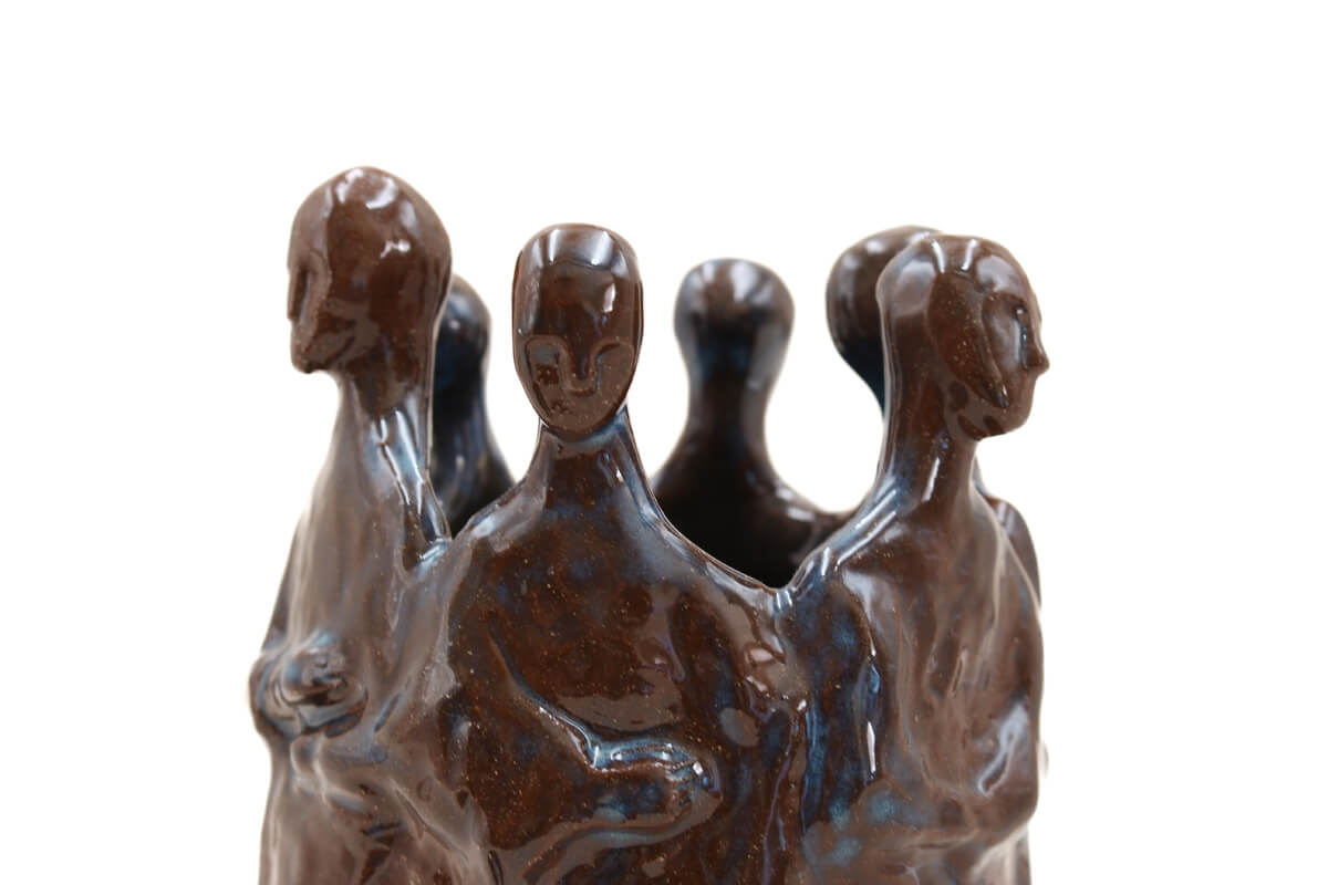 The Pondering Bunch is a handmade ceramic vase that brings sculptural presence and quiet character into one expressive form. Grouped figurative shapes emerge from the vessel’s silhouette, creating a sense of connection, reflection, and stillness. Its deep glossy brown glaze adds richness and dimension, catching the light across the smooth contours and giving the piece a warm, timeless feel. Whether styled with flowers or displayed as a stand-alone object, this sculptural ceramic vase offers a thoughtful balance of artistry and function.